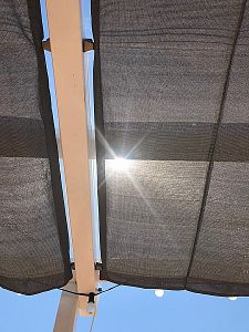 Tkanina striešky je odolná voči slnečnému žiareniu a poveternostným vplyvom, nevybledne, nevybledne ani nestratí svoj tvar. Je vyrobená z vysoko odolného polyetylénu HDPE. Poskytuje až 95 % ochranu pred UVA a UVB žiarením.