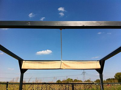 Skladacia strieška - BALDACHÝN - slúži ako variabilný tieň na terasu alebo pergolu. Strieška je vyrobená z tkaného, veľmi odolného materiálu, ktorý prepúšťa vodu. Strieška teda slúži ako ochrana pred slnkom, nie pred dažďom!