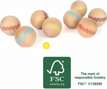 Sada obsahuje 8 menších gulí, jedno prasiatko, textilné vrecko na prenášanie. Skvelá zábava pre deti aj dospelých, vyžaduje sústredenie a zručnosť. Cieľom je dostať sa väčšími guľami čo najbližšie k malej guličke (prasiatku). Hru je možné hrať vonku bez ďalšieho vybavenia, jednotlivo aj v tímoch. Rozmerovo je táto sada na petanque prispôsobená menším deťom, menšie gule lepšie padnú do drobnej detskej rúčky. Ide o prírodný materiál, tzn. prípadné rozdiely vo farbe či kresbe dreva pri jednotlivých komponentoch nie je na závadu. Vyrobené v Nemecku.